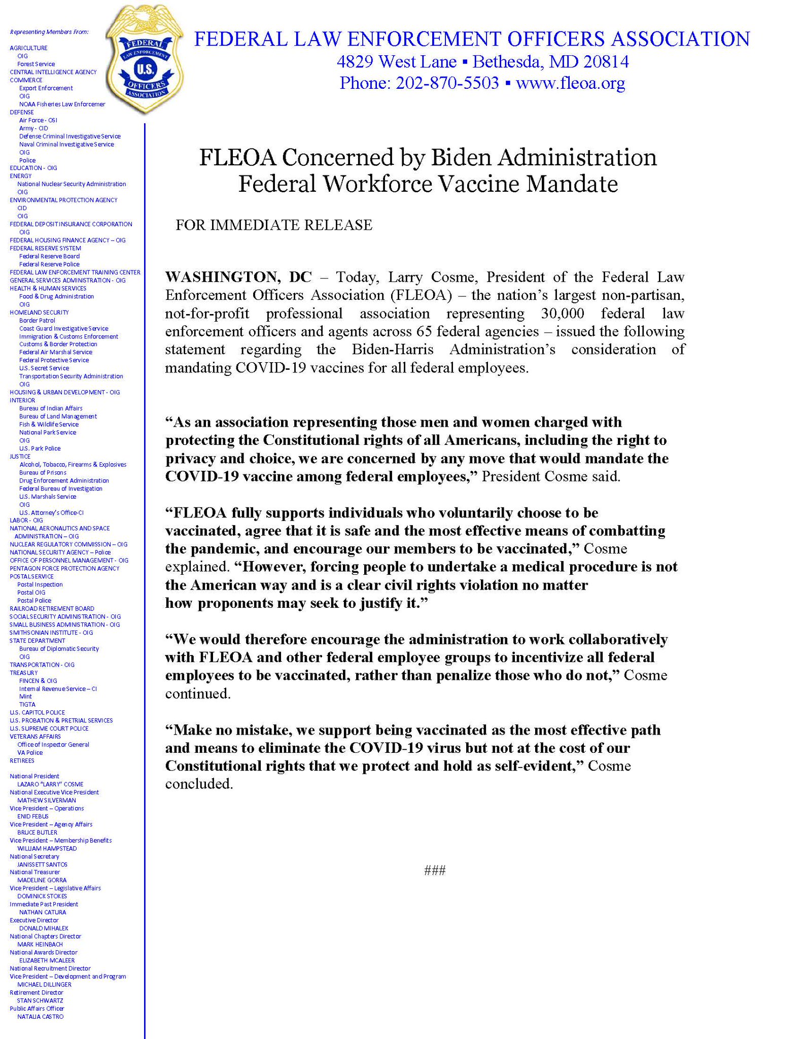 It is also a way to learn about different types of law enforcement jobs. Thanks to fleoa's advocacy, this important legislation covers all federal law enforcement officers. Heinbach's proudest fleoa moment was coordinating the donation and delivery of over 500 pairs of boots for those law enforcement officers that were affected by the katrina and rita hurricanes. On behalf of the federal law enforcement officers association (fleoa), i am writing to you in support of the nomination of maryland u.s. On january 18th, 2021 we were happy to see that the outgoing administration acted on an issues that fleoa had been pressing them and congress to address due to the importance to the law enforcement community, that being the personal safety of law enforcement officers. The foundation was created to financially assist fleoa members and their families in times of need. The federal law enforcement officers association expressed growing concern about president biden's nominee for director of the office of personnel management (opm), kiran ahuja, over her. The federal law enforcement officers association (www.fleoa.org) is the largest nonprofit, nonpartisan professional association that exclusively represents over 26,000 active and retired federal law enforcement officers from over 65 agencies. Docket for federal law enforcement officers association v. About legislative news member services mental health store foundation. Fleoa is proud to be the voice of federal law enforcement. Federal law enforcement officers association. Fleoa endorses thin blue line act.